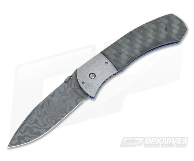 The Handle: Lighter, silver-toned Twist stainless damascus bolsters break up the darker blade and carbon fiber handle scales for a stellar look. Structural carbon fiber is a thicker woven version of the material from leftovers/cutoffs of Apache and Cobra helicopters. This stuff looks killer in person! Ergonomic and palm-filling. Polished, jeweled and blue ano’d titanium liners are hand-filed and hold tight to a thicker backspacer creating solid-as-a-rock construction. And gorgeous too!