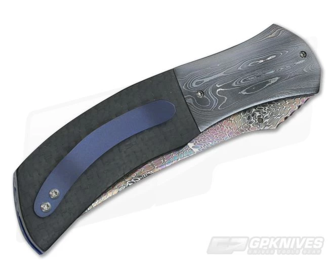 The Handle: Aaron has tossed his own Damascus creation into this piece on the bolsters and backspacer. They are dark with bronze to sometimes blueish swirls accenting the blade and Lightning Strike carbon fiber scales. Polished blue titanium liners create the foundation and have Aaron’s custom hand-filing all the way around.