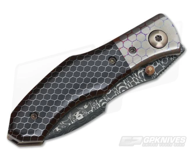 The Blade: Chad Nichols Reptilian Damascus pattern is very striking and seem to blend right into the honeycomb pattern of the C-Tek. The Sheepsfoot blade shape is dominated by a raised swedge that drops back down before rising back up to create a raised thumb ramp. Strategically placed jimping on the ramp and on the bottom of the blade where the index finger sits gives the user control while cutting and inspires confidence. Attached dual thumb studs enables ambidextrous deployment and have been bronzed to match the other titanium hardware.