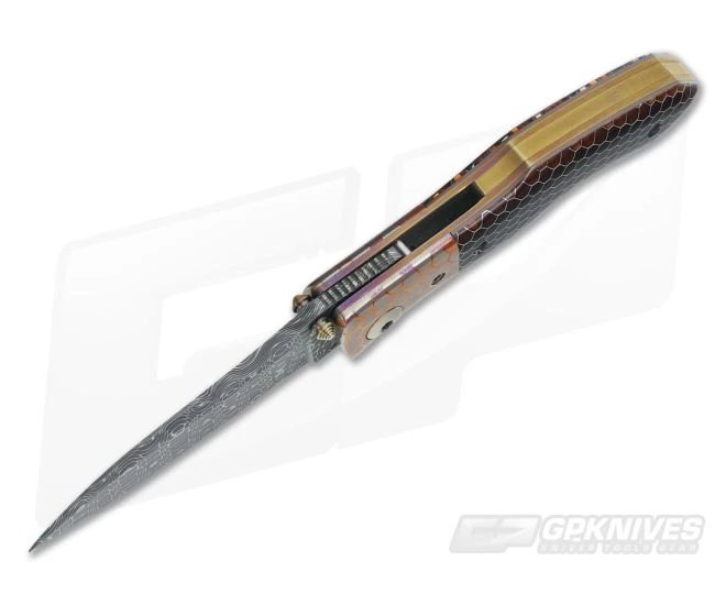 This Alan Folts Chival Prototype is one of two made. An interesting small folder with a raised back handle and shape that conforms to the users palm. The resin infused aluminum honeycomb handle material has an attractive look that grabs attention. The Chival is a small every day carry model with classy Damascus blade and rare superconductor materials. Brand new direct from Alan Folts.