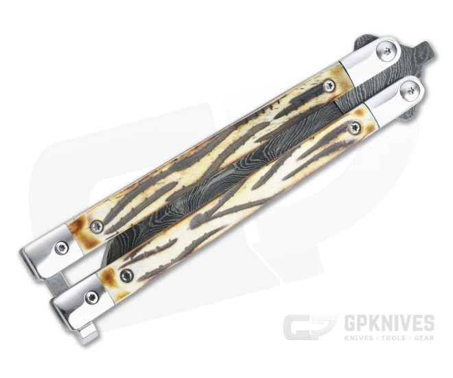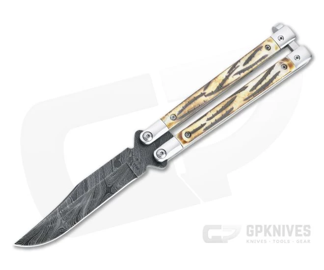 Originally from the Philippines, the balisong or butterfly knife consists of a blade and two handles that rotate from the tang to cover the blade when closed. With plenty of “fidget factor” the balisong has a myriad of uses from practical to tactical. This solid, USA made butterfly knife features a Damascus clip point blade and polished stainless steel handles inlaid with genuine India Stag.