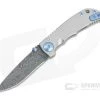 Blade: The clip point profile blade is made from “Lizard” pattern Nichols Damascus, for modern performance and stunning visual appeal. The clip point blade is a classic profile that provides both the fine point and sweeping belling that make it a time tested choice for hunting and everyday cutting tasks. Phosphor bronze washers make for fast, smooth one-handed deployment via the dual anodized thumb studs.
