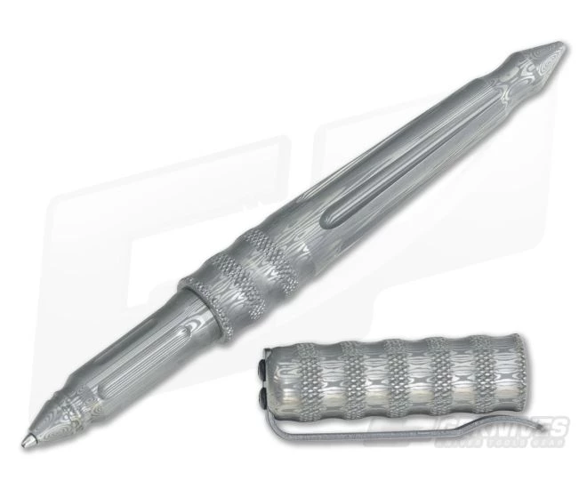 Benchmade Damasteel Tactical Pen with etched blue tongue damasteel body and cap. Damasteel pen tip with black Fisher space pen ink cartridge. Cap fits snug with an internal O-Ring fitting.