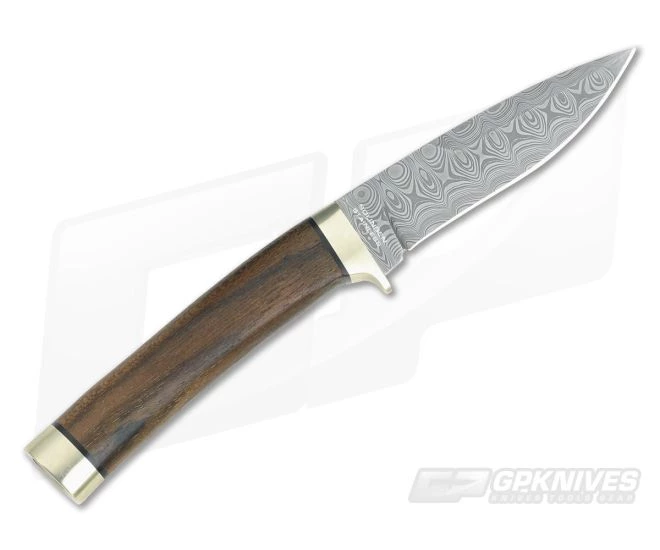 Boker Damascus Hunter with a beautiful stainless damascus blade. The 180 layer damascus is a full tang with a Ziracote wood handle. The wood used is from Belize and is known to be firmly structured and water repellent. Nickel silver guard and pommel. Each knife is serialized on the guard. Includes a wooden display box and certificate of authenticity.