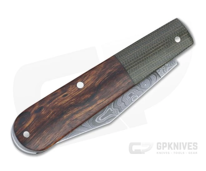 The Barlow is a classic traditional profile, single blade slip joint folder that has a lasting appeal. Boker has created a highly collectable modern version in the Barlow Integral equipped with a stunning Leopard Tank Damascus blade, integral olive green canvas Micarta frame and bolsters and desert ironwood for a lightweight, high performance design with a classic look and modern appeal. Includes a certificate of authenticity and serial number.
