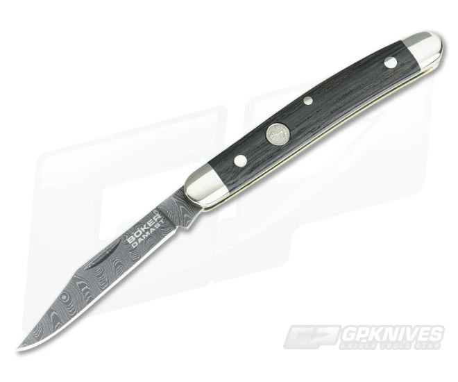 The pen knife is a ubiquitous, small folding knife that was originally used to sharpen quills for writing but is now carried as a gentleman’s knife or lightweight every day utility folder. This high-quality interpretation from Boker knives of Germany employs a Chad Nichols Damascus blade in a classic clip point pattern with nickel sliver bolsters and Bog Oak scales for a perfect combination of sleek and rugged, just what you want in this timeless design. Wonderful for users and collectors alike, this is a jewel in the Boker Solingen line.