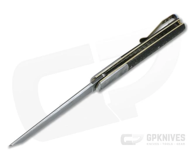 Handle: Two solid titanium liners form the base of this minimalist yet robust folder with the open back construction achieved with a single titanium barrel spacer and the blade pivot. Both liners have a matching bronze anodization and have been jeweled on the inside for a truly custom feel. The liners support chamfered FatCarbon carbon fiber handle scales that are flush fit dovetailed to Boomerang Damascus bolsters. The handles are as visually appealing as they are comfortable in the hand. Reliable and easy to operate, the rear liner forms the liner lock mechanism while titanium Torx hardware completing this premium custom folder.