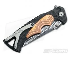 The Handle: Expertly machined carbon fiber handle slabs each measure in at a stocky 0.19″ for a comfortable palm-filling grip. It’s well-balanced with finger grooves that just lock into your hand. Stepped texturing throughout with raw copper inlays on both front and back for an added aesthetic. A ridged black G10 backspacer has a large lanyard window cut out exposed at the bottom taking it up a notch. Near the top a large button lock controls the secured cutting. Custom machined titanium pocket clip with ball bearing retention.