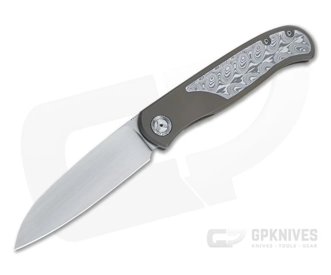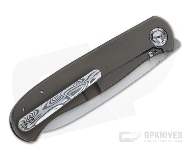 Handle: Matte blasted and anodized bronze, the streamlined titanium handle is chamfered for a comfortable, secure grip that is easy to carry. Damasteel pivot collars, back spacer, pocket clip and handle inlay offer a stunning upgrade for eye-catching style. The robust integral titanium Slab Frame Lock is equipped with a hardened steel lock face insert for smooth operation, rock solid lockup and secure operation for the life of the knife. Ships in a zippered nylon pouch with Certificate of Authenticity.