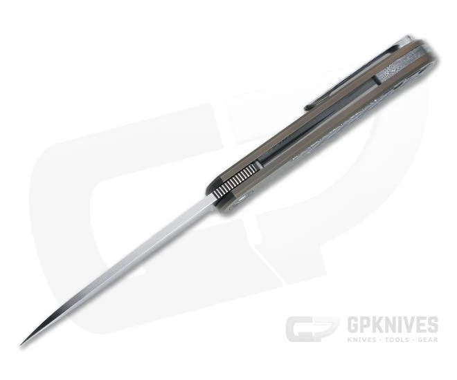 Handle: Matte blasted and anodized bronze, the streamlined titanium handle is chamfered for a comfortable, secure grip that is easy to carry. Damasteel pivot collars, back spacer, pocket clip and handle inlay offer a stunning upgrade for eye-catching style. The robust integral titanium Slab Frame Lock is equipped with a hardened steel lock face insert for smooth operation, rock solid lockup and secure operation for the life of the knife. Ships in a zippered nylon pouch with Certificate of Authenticity.