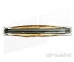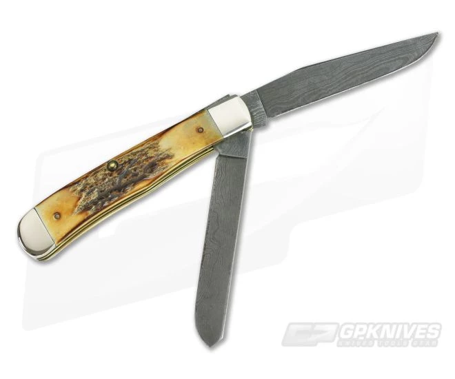 This Case Trapper with genuine stag handles and damascus blades is a prime collector piece. Master blade is stamped CASE with 1 dot USA. Secondary spey bears the pattern number 5254D. Both blades have good snap, no wobble. Blades show very faint signs of shop wear with tiny rubs on back of each. Nice matching stag handles are chip and crack free inlaid with a oval nickel silver shield. The trapper pattern is the most popular among users and collectors. Case damascus knives are normally produced in limited editions or small production runs which enhance value and interest.