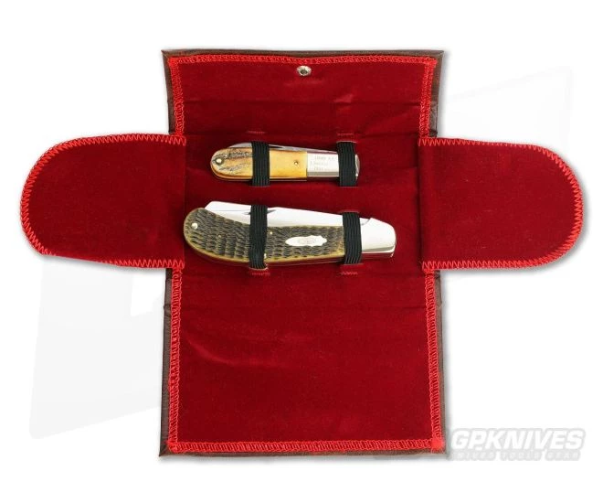 Rare 1990 American Blade Collectors Association Limited Edition Saddlehorn set. Both knives serialized # 0408 of 2500. The 2-Blade CASE XXX USA Saddlehorn master clip blade blade was the first ever to bear the ‘Case XXX’ tang marking. It is 4-5/8 inches closed, 8-1/4 inches open. Both blades are mirror polished stainless. The back of secondary skinner blade is stamped with the pattern number G ROG 62100 SS and the 1990 ABCA logo. The single spear point damascus Barlow is 4 3/4″ open and a closed length of 3 3/8″. Includes original collector’s folding case.