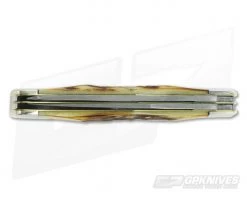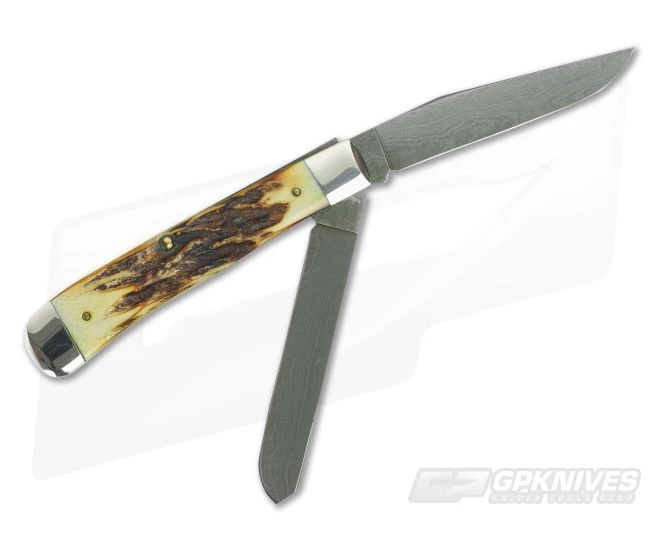 This Case Trapper with genuine stag handles and damascus blades is a prime collector piece. It has nice uniform stag handles with lots of deep character and good snap on both the master and secondary blades. Both blades are made from carbon damascus steel, rarely used in Case production. Pattern number 5254 D. Produced in 1994 using nickel silver bolster and brass liner construction.