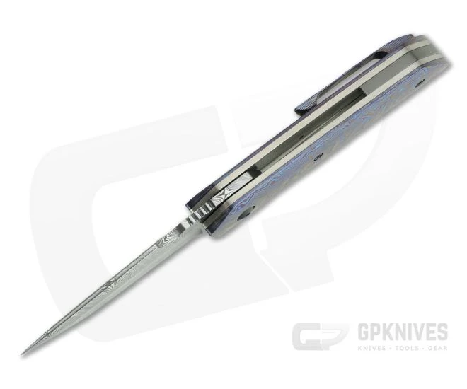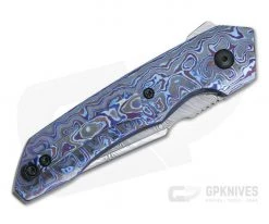 Handle: While the Damasteel blade is beautiful the Kraken Black Timascus is the star of the show with a dramatic show of pattern and color. Black hardware is subdued allowing the handle material to really shine. Orange peel textured titanium liners support the scales and form the liner lock mechanism that is smooth and solid and construction is rounded out with a polished zirconium backspacer.