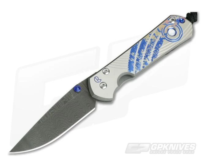 Fresh from Chris Reeve Knives this Stainless Damascus Small Sebenza 21 is outfitted with an intricate Unique Graphic and gorgeous Mother of Pearl cabochon. Its front slab features a one-of-a-kind design in polished and anodized titanium with the Mother of Pearl inlay as the center piece. This is a stunning piece for any collection.