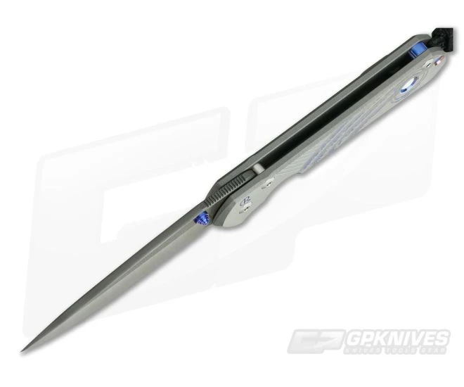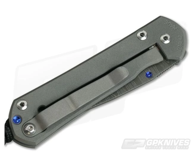 Blade: The Small version gives its user 2.87 inches of polished, shaving sharp cutting edge built from premium Devin Thomas stainless Ladder Damascus steel. It is hollow ground for supreme sharpness and fully usable for day to day. A thumb ramp on the spine has perfect jimping, nearly an inch and perfect placement. The rest of the spine is crowned, smooth and polished. This version features a single blue titanium thumb lug opener allowing the user to open the blade from the front side. It operates on a pivot system using oversize bronze washers with grease-filled pockets for smooth, no friction operation. Lock up is always solid and reliable.
