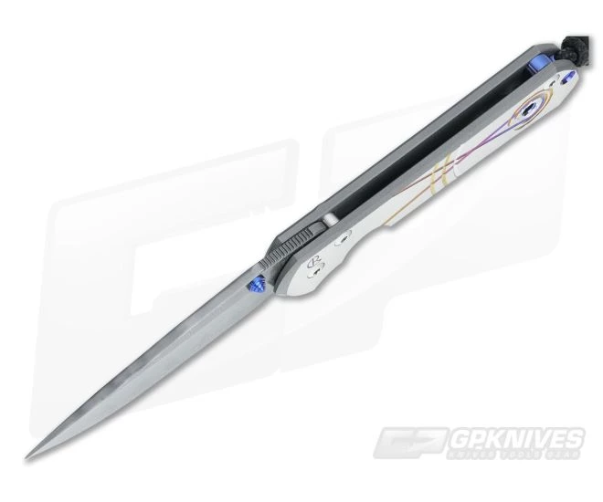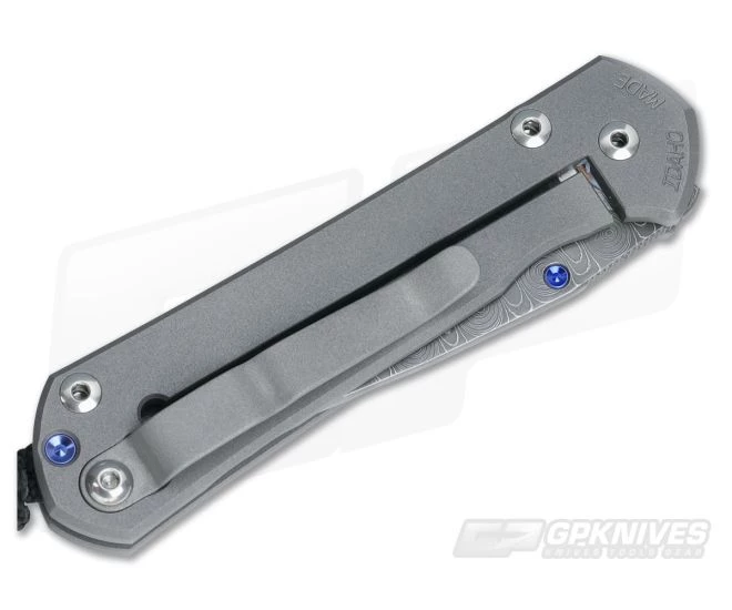 The Blade: The Small version gives its user 2.87 inches of polished, shaving sharp cutting edge built from exquisite damascus steel. This steel is a purely consistent unique Raindrop pattern pairing well with uniquely anodized patterned handle. It is hollow ground for supreme sharpness ready to meet your collection. A thumb ramp on the spine has perfect jimping, over half an inch and perfect placement. The rest of the spine is smoothed revealing intricate details of the pattern. A single blue anodized titanium thumb lug allows the right handed user to open and operate the blade easily. It moves on a pivot system using oversized bronze washers with grease-filled pockets for smooth, no friction operation. Lock up is always solid and reliable.