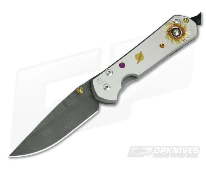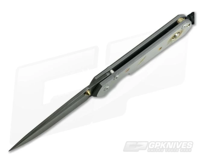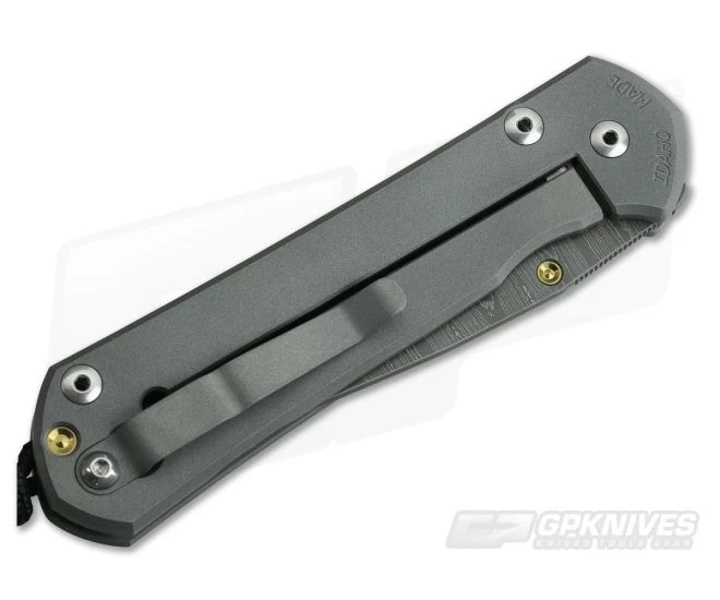 Blade: The Large version gives its user 3.5 inches of polished, shaving sharp cutting edge built from premium, Devin Thomas stainless Ladder pattern Damascus steel. It is hollow ground for supreme sharpness and fully usable for day to day. A thumb ramp on the spine has perfect jimping, nearly an inch and perfect placement. The rest of the spine is crowned and smooth. This version features a single Gold titanium thumb lug opener allowing the user to open the blade from the front side. It operates on a pivot system using oversize bronze washers with grease-filled pockets for smooth, no friction operation.
