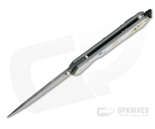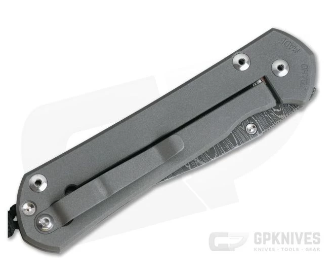 Blade: The Large version gives its user 3.5 inches of polished, shaving sharp cutting edge built from premium, Chad Nichols stainless Ladder pattern Damascus steel. It is hollow ground for supreme sharpness and fully usable for day to day. A thumb ramp on the spine has perfect jimping, nearly an inch and perfect placement. The rest of the spine is crowned and smooth. This version features a single Silver titanium thumb lug opener allowing the user to open the blade from the front side. It operates on a pivot system using oversize bronze washers with grease-filled pockets for smooth, no friction operation.