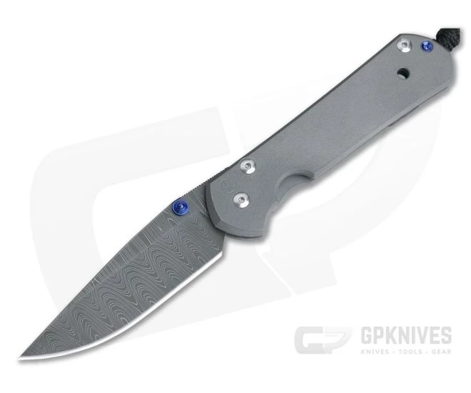 Blade: The Large version gives its user 3.5 inches of polished, shaving sharp cutting edge built from premium Devin Thomas stainless Ladder Damascus steel. It is hollow ground for supreme sharpness and fully usable for day to day. A thumb ramp on the spine has perfect jimping, nearly an inch and perfect placement. The rest of the spine is crowned, smooth and polished. This version features a single blue titanium thumb lug opener allowing the user to open the blade from the front side. It operates on a pivot system using oversize bronze washers with grease-filled pockets for smooth, no friction operation. Lock up is always solid and reliable.