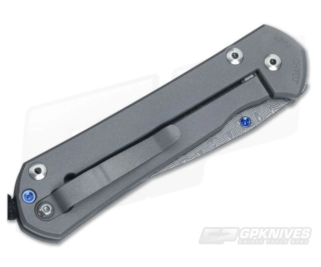 The Blade: This Large 21 version gives its user 3.5 inches of polished, shaving sharp cutting edge built from premium Devin Thomas Stainless Basket Weave damascus steel. It is hollow ground for supreme sharpness and fully useable for day to day. A thumb ramp on the spine has nearly an inch of jimping with perfect placement for use. The rest of the spine is crowned, smooth and polished. This version features a single blue titanium thumb lug opener allowing the user to open the blade from the front side. It operates on a pivot system using oversized bronze washers with grease-filled pockets for smooth, no friction operation.