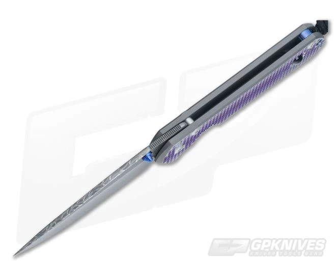 The Handle: Made of precision machined and hand finished titanium slabs, the frontside of the handle features a purple unique graphic with Amethyst Cabochon inlay while the backside has been bead-blasted for a matte finish. A Reeve Integral Frame Lock holds the blade solidly in the open position and can be simply disengaged. An attached black lanyard and titanium tip up carry pocket clip round out this truly one-of-a-kind work of art.