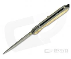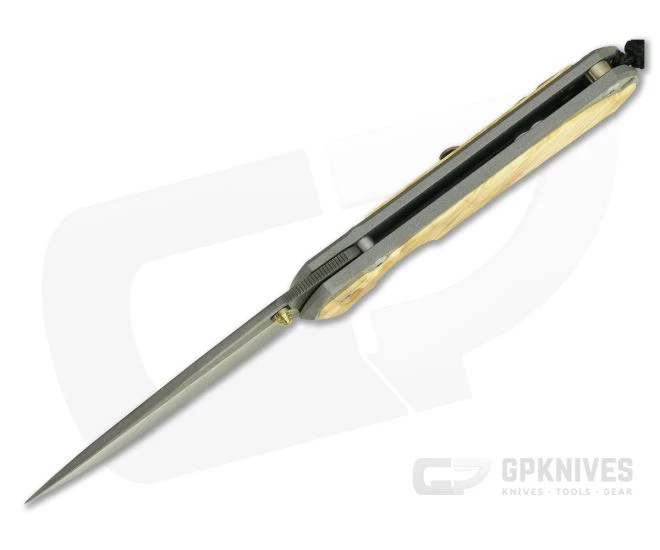 Handle: The dual slabs of 6AL4V titanium are satin finished and inlaid with Box Elder wood. The front inlay is a large, single piece that lends a sleek elegance to the clean design. The Reeve Integral Lock utilizes the titanium frame to deliver “bank vault” like lockup. An upgraded Ceramic Ball Interface increases the reliability and life of the lock while offering an extra smooth operation of both lock and blade. The construction is completed with full titanium hardware including a gold anodized spacer and lanyard pin. A black nylon lanyard comes installed.