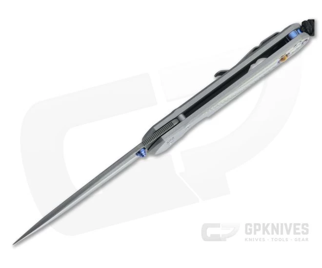 Blade: The large Sebenza 31 delivers just over 3.5 inches of polished, shaving sharp cutting edge on the Boomerang Damascus drop point blade. The deep hollow grind offers exceptional slicing performance and extended life through sharpening and use. The Damascus blade is etched to showcase the stunning Boomerang pattern of the layered steels while the jimped thumb ramp offers traction and comfort. The rest of the spine is crowned smooth for a custom feel. A single titanium thumb lug allows the right-handed user to open and operate the blade easily. It moves on a pivot system using oversize bronze washers with grease-filled pockets for a smooth, hydraulic operation.