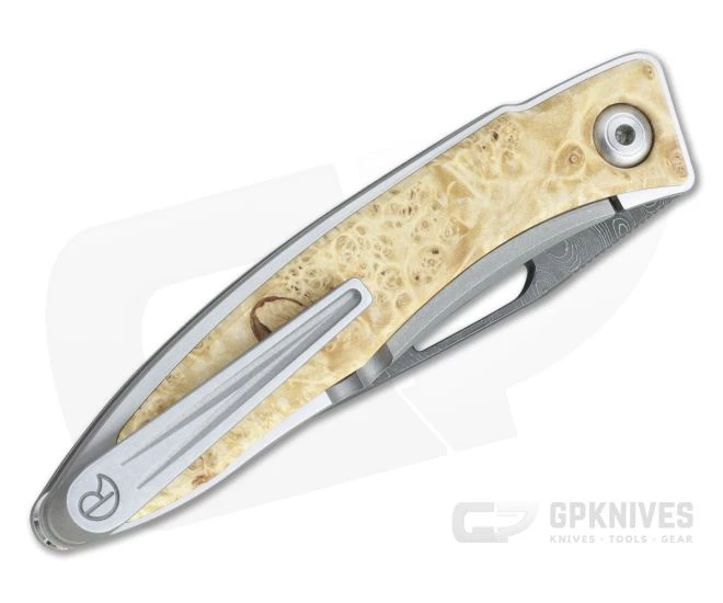 Handle: Warm and striking Box Elder burl wood scales have been inlaid into the front and back of the satin polished titanium handle flats while the edges and lock bar are ultra-fine bead blasted matte gray for contrast and feel. Stabilized Box Elder burl wood delivers a stunning look with unique burl figuring in warm, yellow-gold tones. Fit and finish on this timeless classic is outstanding while the Reeve Integral Frame Lock delivers smooth operation and rock solid lock up for secure use.