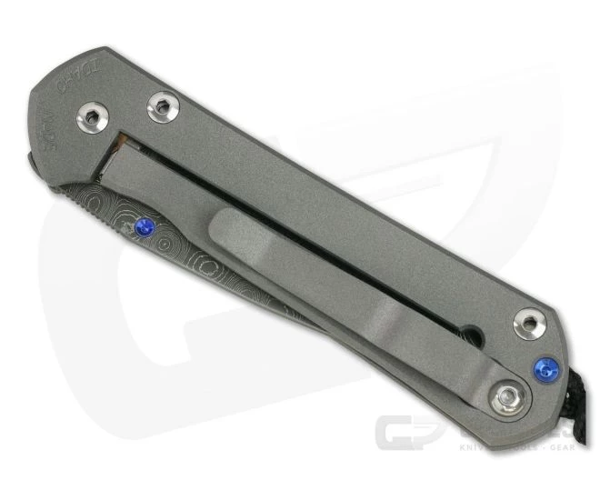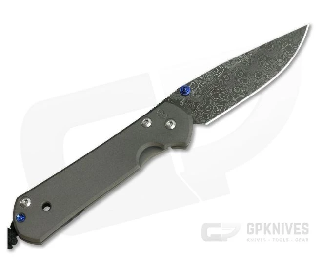 Blade: The Small version gives its user 2.87 inches of polished, shaving sharp cutting edge in a drop point pattern, stainless Damascus steel blade. The pattern welded steel is etched to highlight the striking contrast while the hollow grind offers excellent cutting performance. The smooth, crowned spine is classy with a short section of jimping for traction. Oversize, greased bronze washers deliver smooth operation opening via the single blue thumb stud.