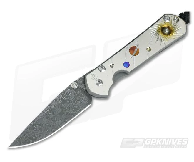 Fresh from Chris Reeve Knives this Chad Nichols Damascus Small Sebenza 21 is outfitted with the Unique Graphic “Solar System”. Its front slab features a one-of-a-kind design complete with stars, planets, rings and a Pyrite Cabochon inlay playing the part of the blazing sun in space. This stunner is brand new direct from Chris Reeve Knives.