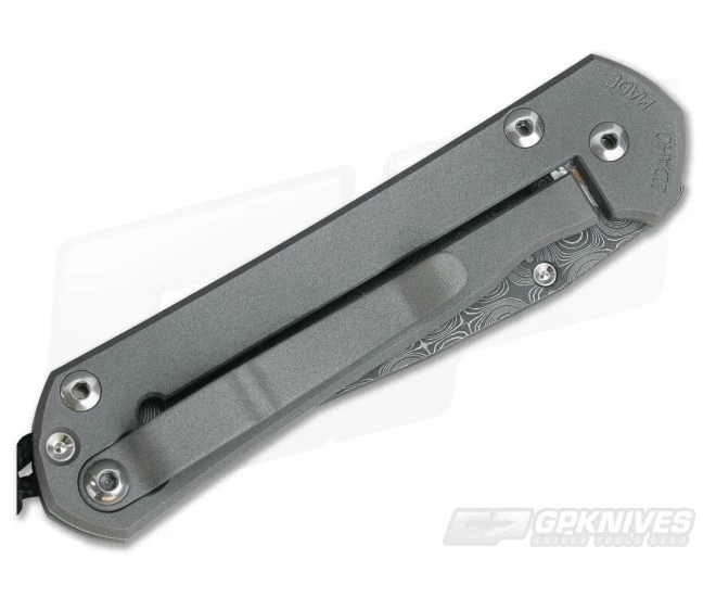 The Blade: The Small version gives its user 2.87 inches of polished, shaving sharp cutting edge built from premium Chad Nichols stainless Raindrop damascus steel. It is hollow ground for supreme sharpness and fully usable for day to day. A thumb ramp on the spine has perfect jimping, nearly an inch and perfect placement. The rest of the spine is crowned, smooth and polished. This version features a single Gold titanium thumb lug opener allowing the user to open the blade from the front side. It operates on a pivot system using oversized bronze washers with grease-filled pockets for smooth, no friction operation. Lock up is always solid and reliable.