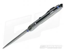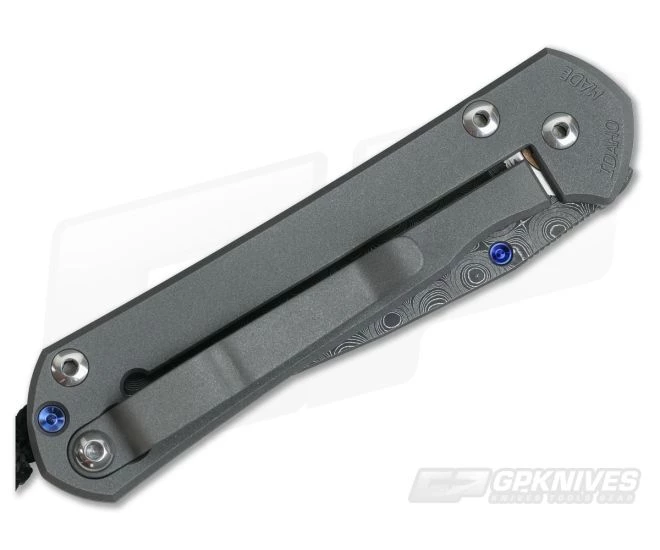 The Blade: The Small version gives its user 2.87 inches of polished, shaving sharp cutting edge built from premium Chad Nichols stainless Raindrop damascus steel. It is hollow ground for supreme sharpness and fully usable for day to day. A thumb ramp on the spine has perfect jimping, nearly an inch and perfect placement. The rest of the spine is crowned, smooth and polished. This version features a single Blue titanium thumb lug opener allowing the user to open the blade from the front side. It operates on a pivot system using oversized bronze washers with grease-filled pockets for smooth, no friction operation. Lock up is always solid and reliable.