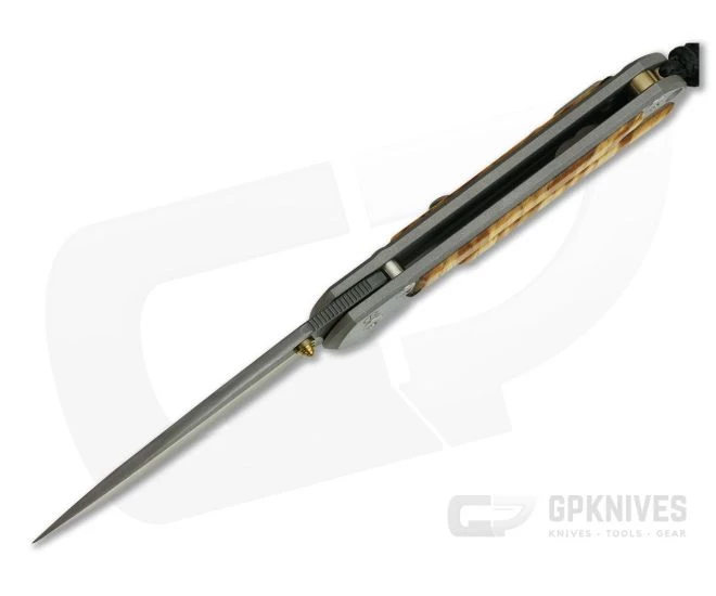 Handle: Made of precision machined and hand polished titanium slabs, the wood inlays are cut, smoothed and carefully secured in the front and back of the handle. A blasted Reeve Integral Frame Lock holds the blade solidly in the open position and can be easily disengaged. An attached black lanyard with gold Ti spacers and a blast finished titanium tip up carry pocket clip round out this truly handsome work of art.