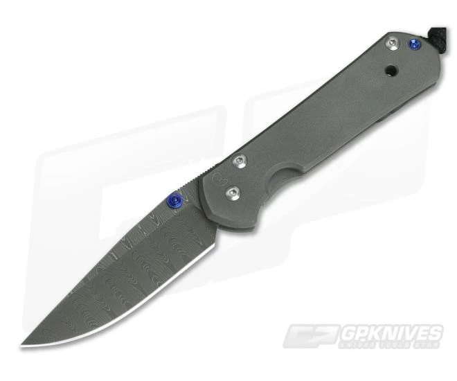 Blade: The Small version gives its user 2.87 inches of polished, shaving sharp cutting edge built from stainless Damascus steel. This steel is folded over and over and over to create the maker’s preferred pattern. It is hollow ground for supreme sharpness and gives a unique look to the knife. A thumb ramp on the spine has perfect jimping, over half an inch and perfect placement. The rest of the spine is crowned, smooth and polished. This version features a perfect drop point for tackling the daily jobs. It operates via a blue anodized thumb lug on a pivot system using oversize bronze washers with grease-filled pockets for smooth, no friction operation. Lock up is always solid and reliable.