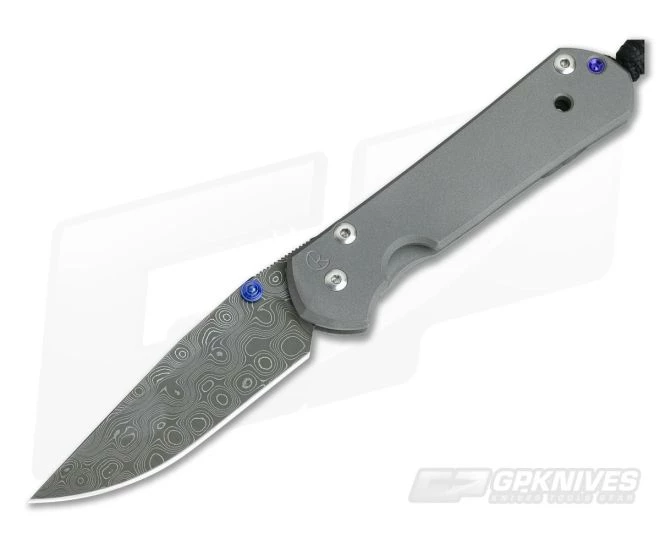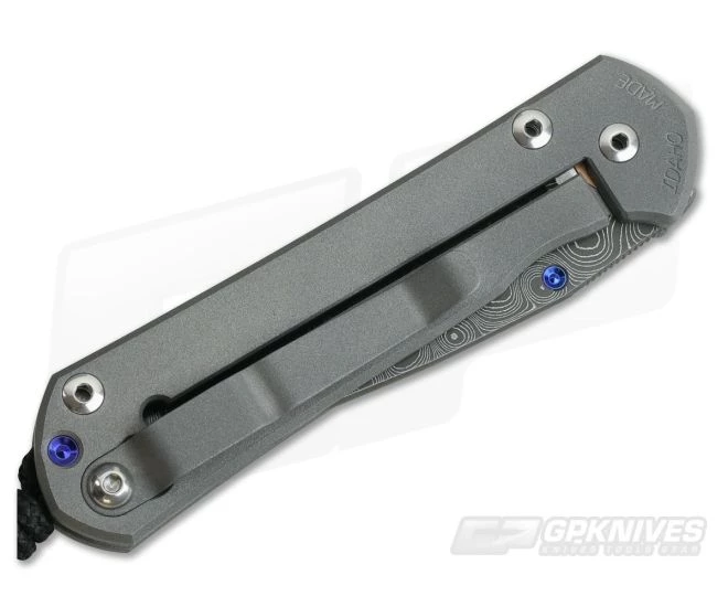 Blade: The Small version gives its user 2.87 inches of polished, shaving sharp cutting edge in a drop point pattern, stainless Damascus steel blade. The pattern welded steel is etched to highlight the striking contrast while the hollow grind offers excellent cutting performance. The smooth, crowned spine is classy with a short section of jimping for traction. Oversize, greased bronze washers deliver smooth operation opening via the single blue thumb stud.