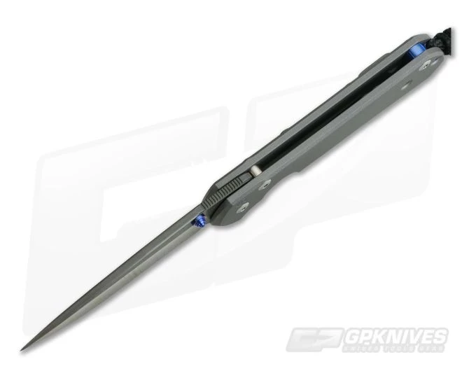 Handle: Two slabs of matte gray, sandblasted titanium form the handles with chamfered edges for a smooth, comfortable grip for small to medium sized hands. Forward cutouts allow the user access to the Reeve Integral Frame Lock mechanism and a comfortable place for fingers to rest. The lock is reliable, easy to use and virtually maintenance free. Construction is completed with all titanium hardware including a blue anodized barrel spacer with matching lanyard spacer.