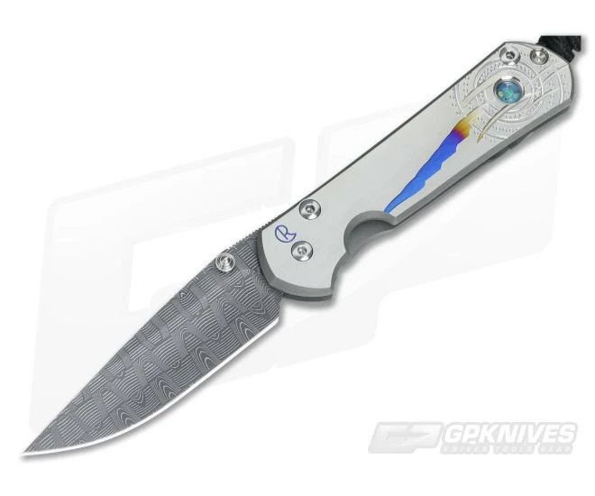 The Handle: Made of precision machined titanium slabs, the front side of the handle features the polished unique design with cabochon inlay with a fully blasted lock side. A Reeve Integral Frame Lock holds the blade solidly in the open position and can be simply disengaged. An attached black lanyard with silver Ti spacer bead and titanium tip up carry pocket clip round out this truly one-of-a-kind work of art.