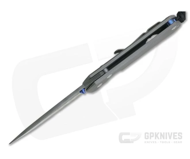 Handle: The dual slabs of 6AL4V titanium are sandblasted for a nice, tactile feel that will develop a unique patina with wear over time. The Reeve Integral Lock utilizes the titanium frame to deliver “bank vault” like lockup. An upgraded Ceramic Ball Interface increases the reliability and life of the lock while offering an extra smooth operation of both lock and blade. The construction is completed with full titanium hardware including a blue anodized spacer and lanyard pin. A black nylon lanyard comes installed.