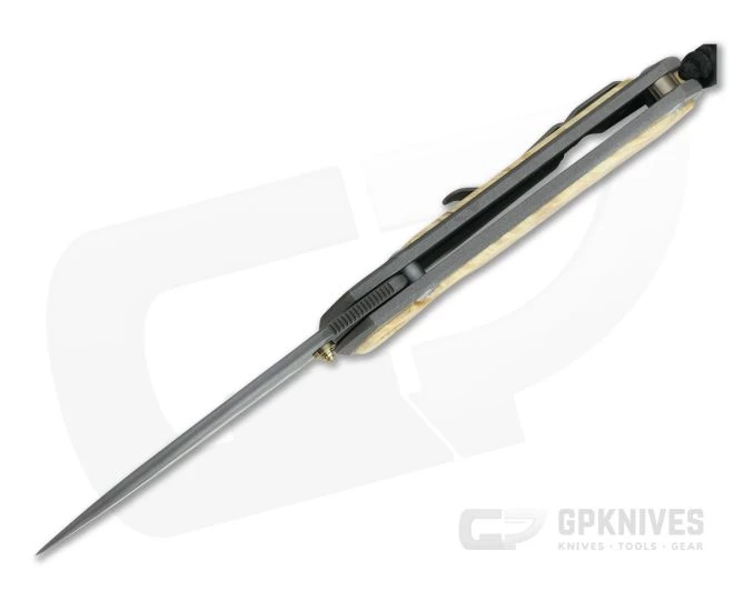 Blade: The small Sebenza 31 delivers just under three inches of polished, shaving sharp cutting edge on the Boomerang Damascus drop point blade. The deep hollow grind offers exceptional slicing performance and extended life through sharpening and use. The Damascus blade is etched to showcase the stunning Boomerang pattern of the layered steels while the jimped thumb ramp offers traction and comfort. The rest of the spine is crowned smooth for a custom feel. A single gold anodized titanium thumb lug allows the right-handed user to open and operate the blade easily. It moves on a pivot system using oversize bronze washers with grease-filled pockets for a smooth, hydraulic operation.