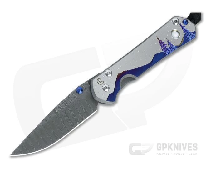 This version comes with a Chad Nichols Stainless Ladder Damascus drop point blade and Unique “Night Sky” Graphic with Mother of Pearl Cabochon on titanium handles.