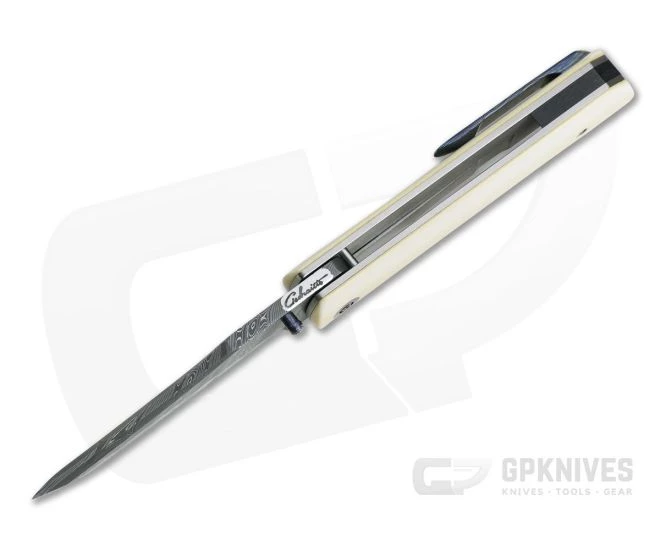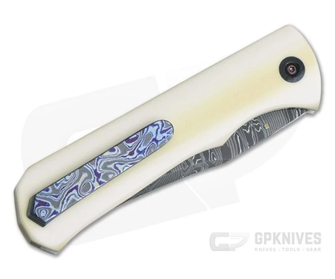 Blade: A unique combination of Bowie-style clip point and classic Japanese Tanto, the Small Marauder blade is compound ground with a flat tip and hollow saber primary grind. This combination offers a very strong, piercing point with exceptional slicing along the straight edge. Norris Modified Fire Clone Stainless Damascus offers a visually striking look with modern stainless performance. The blade rides silky smooth on nylon washers and deploys via a single black Timascus thumb stud.