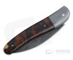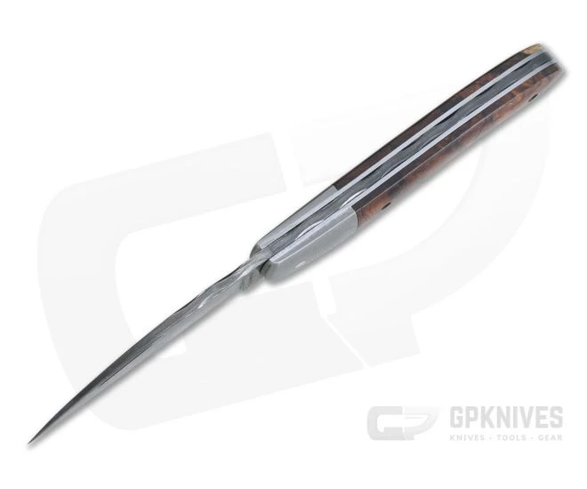 The Chuck Hawes Custom Wharncliffe Whittler is a classic slip joint design made in the traditional fashion. Beautiful and durable, exhibition grade Ironwood handle scales are flush fit to Damascus bolsters over stainless steel liners. The handles house a razor sharp, hand forged Burl pattern Damascus blade and file-worked Damascus back spring.