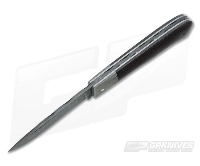 The Blade: Hawes handforged damascus combines 15N20 stainless with 1095 carbon steel for a bold and distinct pattern. Drop point style with single nail nick, razor sharp plain edge and custom filework along the spine. Pronounced half stop with medium backspring construction.