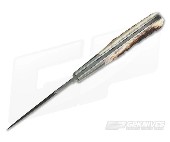 Handle: Stainless steel liners support rustic Sambar Stag handle scales and hand forged Damascus bolsters all meeting seamlessly. A full length Damascus backspring rounds out the handle construction and is embellished with the same file work found on the spine of the blade.