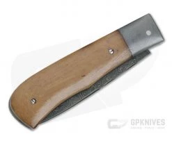 Blade: Hawes hand forged Damascus combines 160 layers of 1095 and L6 high carbon steels creating a unique Burl pattern. The Remington-style drop point blade is opened with single nail nick and comes with a razor sharp convex grind. The forward swedge and file work along the spine adds a custom feel. The blade opens with a pronounced half stop with strong Damascus back spring construction.
