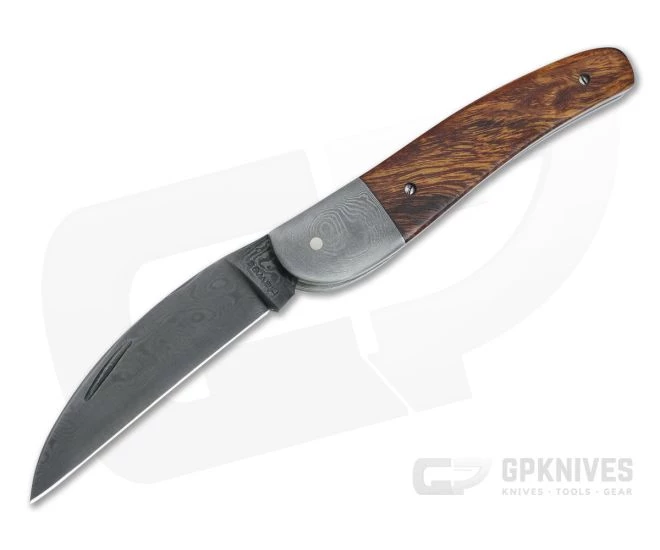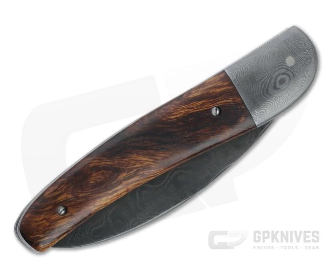 Designed as a modern take on the classic whittle pattern the Chuck Hawes Custom Wharncliffe Whittler delivers the classic robust slip joint folding knife with hand make precision and stunning looks. This custom piece has highly figured Desert Ironwood handle scales flush fit to Damascus bolsters with matching file worked back spring and a hand forged Modified Ladder pattern Damascus blade.