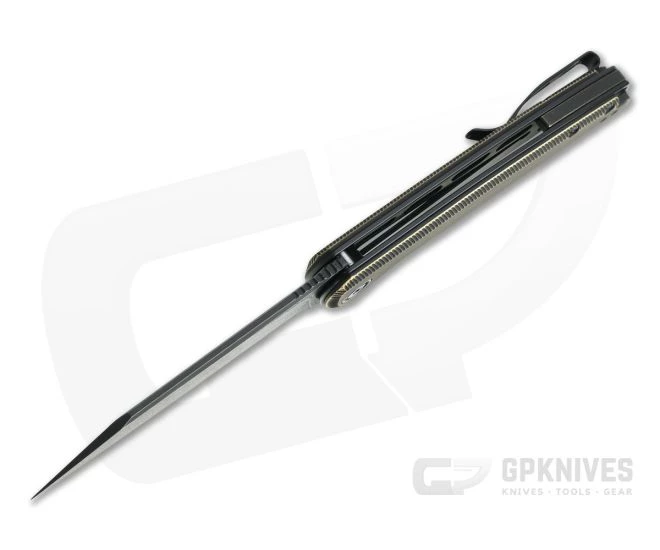 Handle: Skeletonized black stainless steel liners support black hand rubbed brass handle scales delivering a hefty and visually striking handle. Ergonomic and neutral for versatility, the handles have textured chamfers for traction and comfort. One liner makes a simple, effective, and reliable locking mechanism with scallops for positive disengagement.