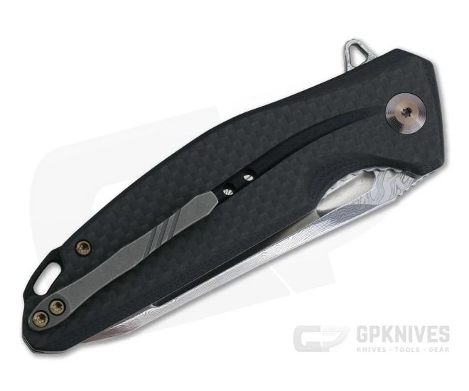 Handle: The handles are clean and simple in design with plenty of style thanks to the carbon fiber overlay and gold anodized stainless steel liner construction. The liners offer a solid foundation for durability with a simple and reliable liner lock mechanism for security in use. The Black G10 scales are lightweight, durable and nearly impervious to the elements making this a perfect choice for everyday carry and use while the milled line in the carbon fiber overlay enhances both traction and style. Solid titanium hardware rounds out the construction along with a generous, inline lanyard hole in the G10 back spacer.