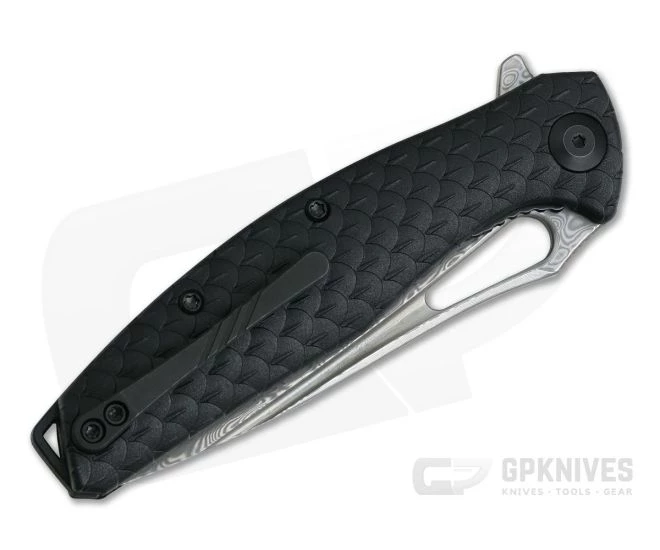 Blade: Made from polished and acid etched Chinese Damascus the hollow ground blade rides on a stainless steel ball bearing pivot for ultra smooth, fast deployment via the blade hole or integral flipper tab. The blade is slim with a full length clip running from the thumb ramp above the blade hole down to the razor sharp tip. This blade is durable for serious use while being fast and maneuverable for finer work with a full size index finger choil for added control. Fullers that run down either side of the blade add another touch of style to this highly utilitarian blade.